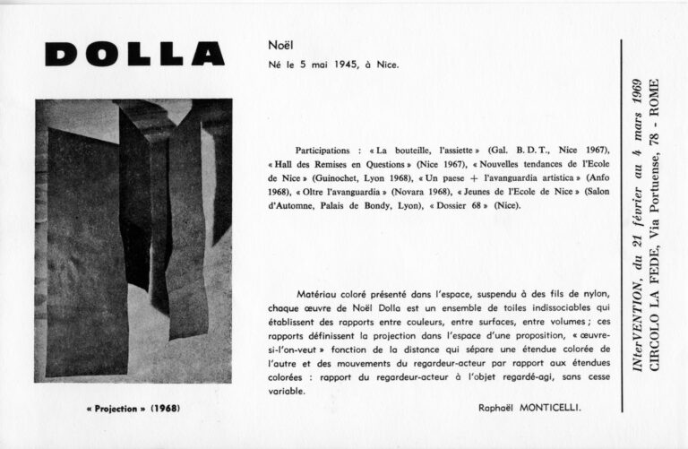 L’exposition INterVENTION au Circolo la fede, en février 1969, n’a jamais eu lieu. Quatre artiste étaient prévus : Alocco, Dolla, Saytour et Viallat. J’avais rédigé les textes de présentation d’Alocco et Dolla. Dans la rubrique consacrée à Marcel Alocco, sur ce site, j’ai donné le petit texte que j’avais rédigé sur son travail. J’ai aussi repris l’information donnée par le centre Pompidou à propos de cette exposition, et de la décision des artistes de la garder dans leur CV...