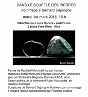En 2016, à la bibliothèque Louis Nucera (Nice), hommage était rendu à Bernard Dejonghe par Alain Fourchotte, compositeur, dont une pièce était créée par Philippe Cauchefer, violoncelliste à l’orchestre Cannes Côte d’Azur, François Goalec, photographe, et moi même. Ci-dessous, un lien pour une captation d’amateur de ma lecture sur la video de François Goalec, « Dans l’atelier de Bernard Dejonghe ». Pour le texte, qui figure aussi ci-dessous, j’avais repris celui qui figurait en 2012 sur les panneaux de l’exposition au Prieuré Ronsard dont le titre était Bribes de temps