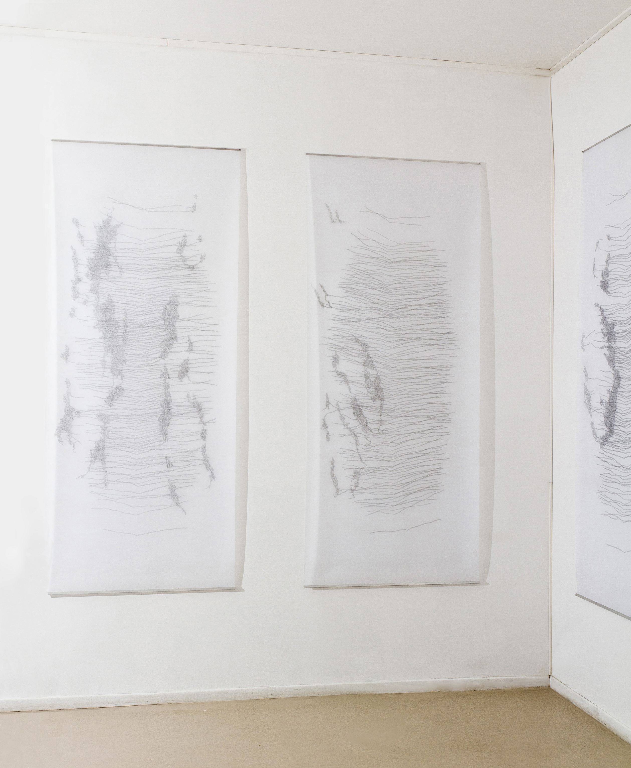 Renversement du phénomène, l’écriture deviendrait une matière - le dessin par la verticalité, par le travail de la main, un écoulement.