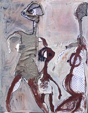 Un morceau de toile était détachée du châssis, dit B. sa main droite part vers le haut pour y figurer un geste d’arrachement ; L. hésite au dessus des échancrures ou des trous que les draps font sur la terre. Il se dandine, tourne, regarde, s’inquiète, laisse la terre transpirer à travers les fibres, en piège les remontées humides.