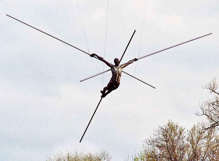 Corps, bel échassier doublement cloué, sur ce qui te hausse et t’éloigne du sol et en même temps t’y fixe et t’y maintiens, toi qui n’es plus ainsi corps en gloire sur le piédestal, mais, à bout d’équilibre dans ta chute sans cesse repoussée, quel est ce rêve qui te pousse comme s’il poussait tes membres.
